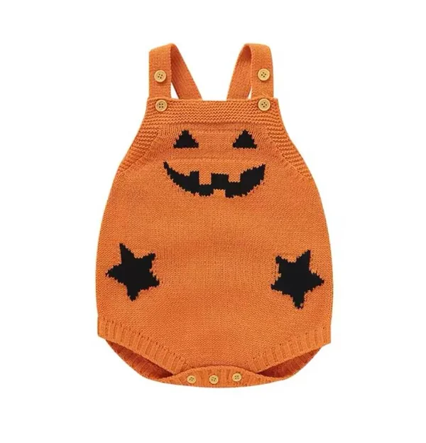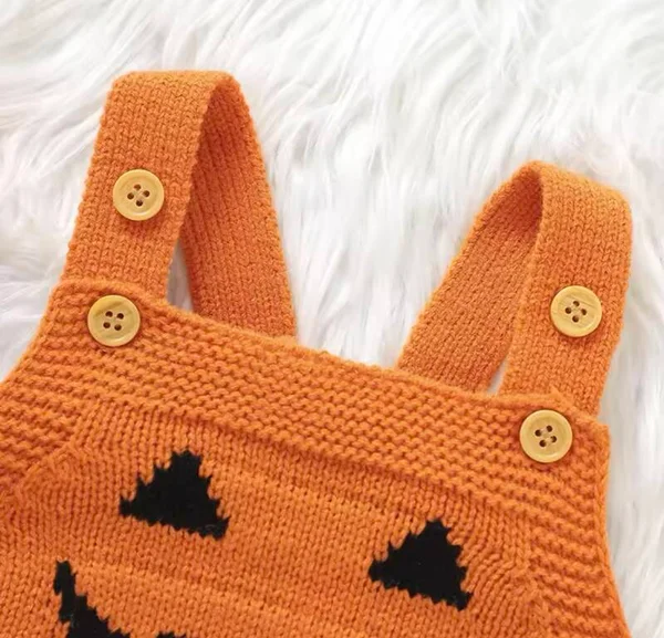 The Romper Baby Pumpkin Knitted Sweatshirt is a cozy, pumpkin-themed sweater made from soft knit fabric, perfect for babies.